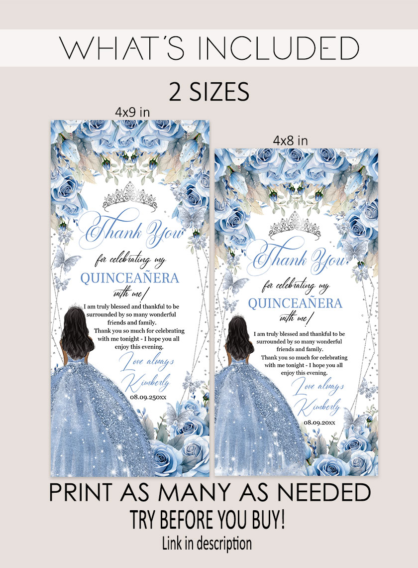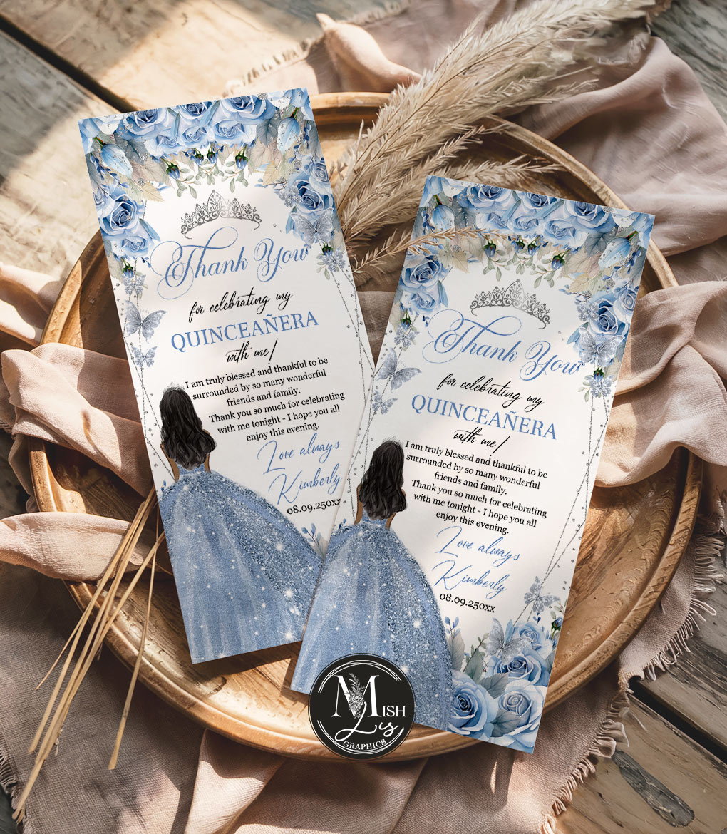 Purchase Royal Baby Blue Quinceañera thank you card, edit, and print. No software needed! Simple, easy to use – Text color and size can be changed.