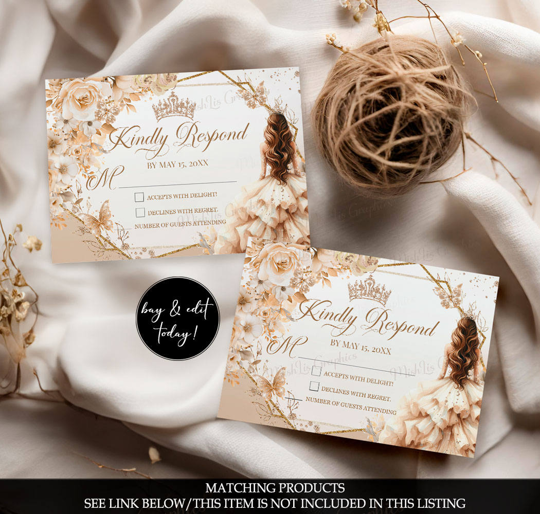 Be the first to review “Beige Champagne Quinceañera Save the Date | Gold Crown & Glitter Dress”