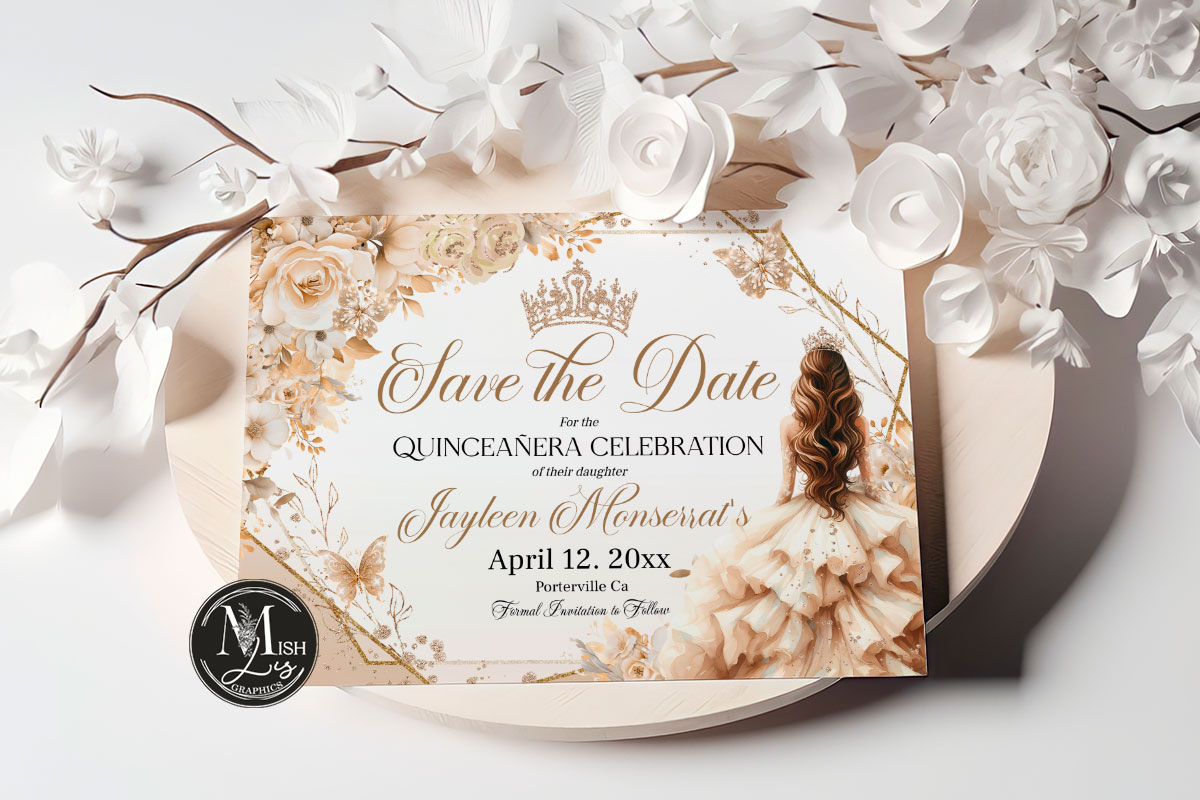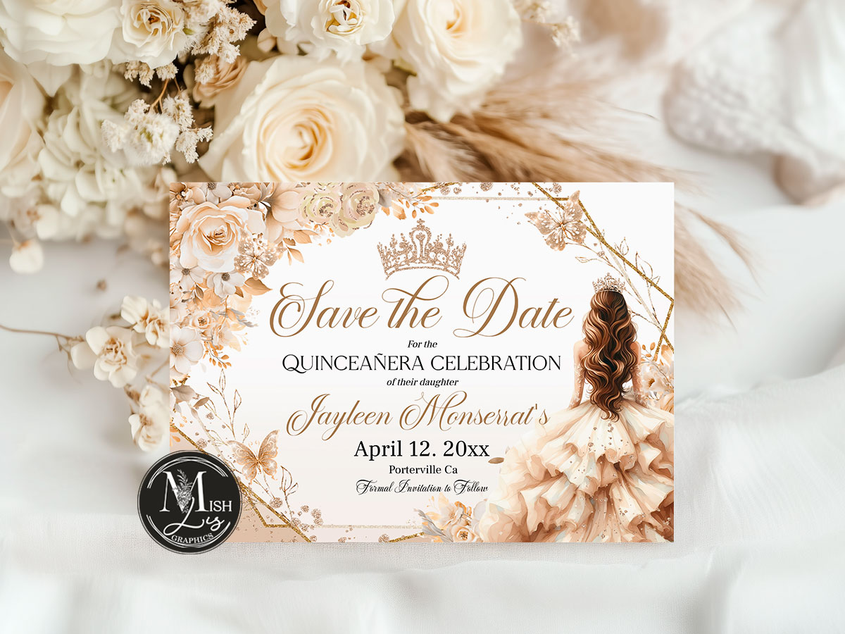 FILE INFORMATION – Beige Champagne Quinceañera Save the Date Card