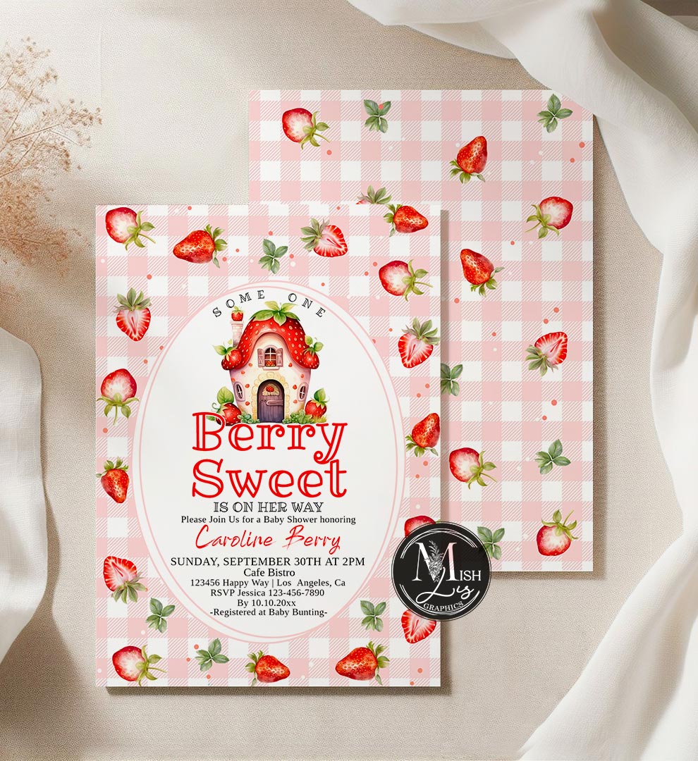 Berry Sweet Invitation  a charming editable strawberry template perfect for your baby shower, girl party, or berry-themed celebration. Customize instantly and create a delightful, sweet garden-style invitation with vibrant red strawberries.