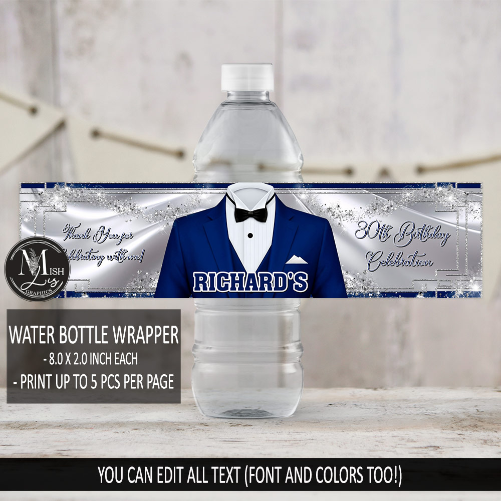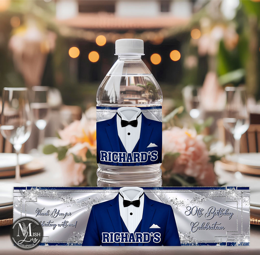 Blue Tuxedo Water Bottle label features Elegant Gentleman Theme, Formal Blue Suit Design, and Classy Party Decor. Perfect for birthdays, baby showers, and stylish celebrations with printable bottle labels.