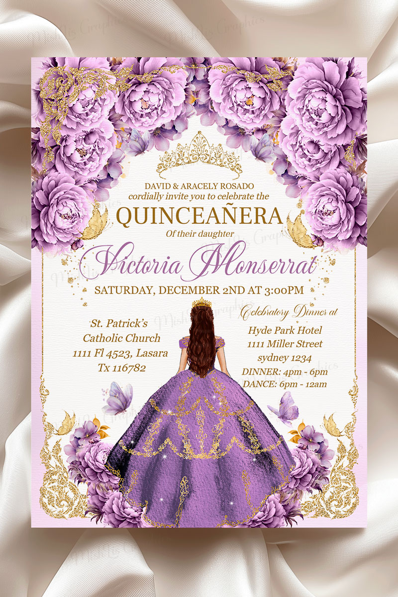 Purple Gold Quinceañera Invitation | Royal Lavender Floral and Gold Crown Design, Floral Mis Quince Anos Sweet 16 Birthday Girl Tiara