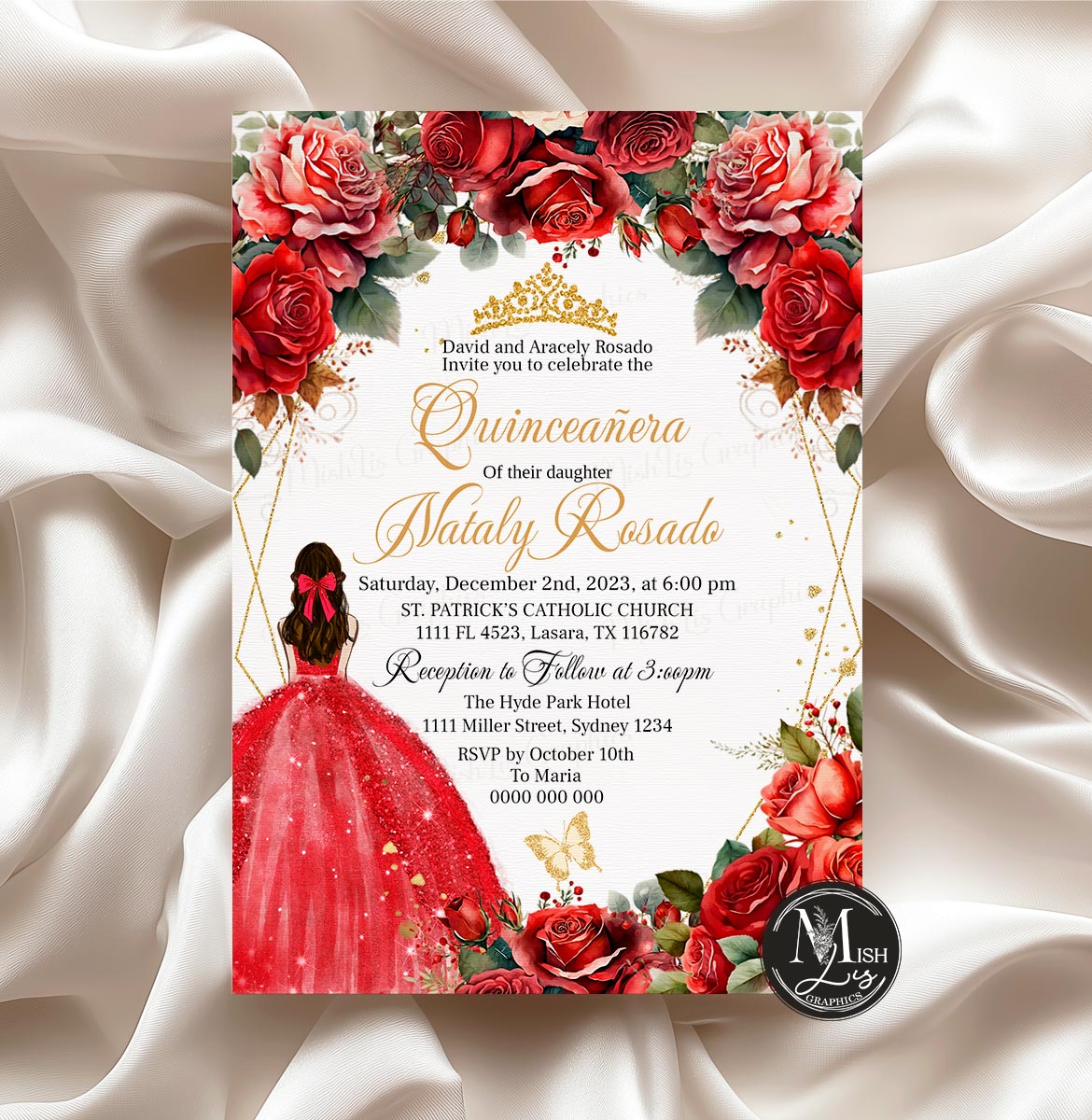 Red Roses Quinceañera Invitation with Gold Glitter Dress