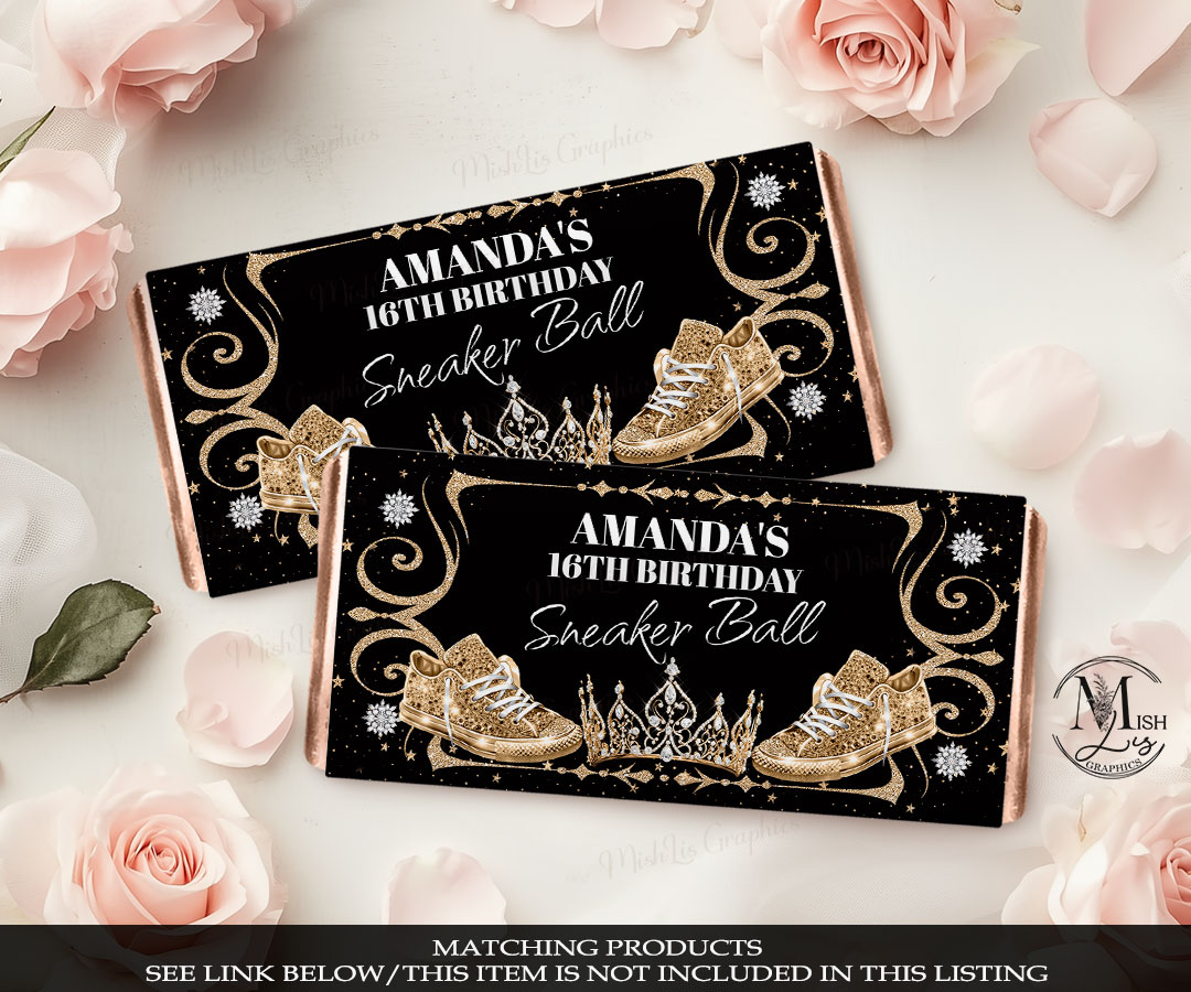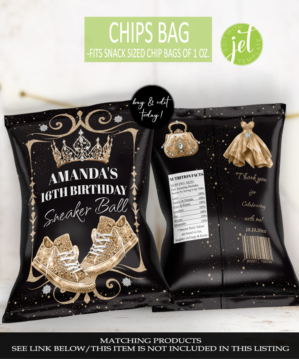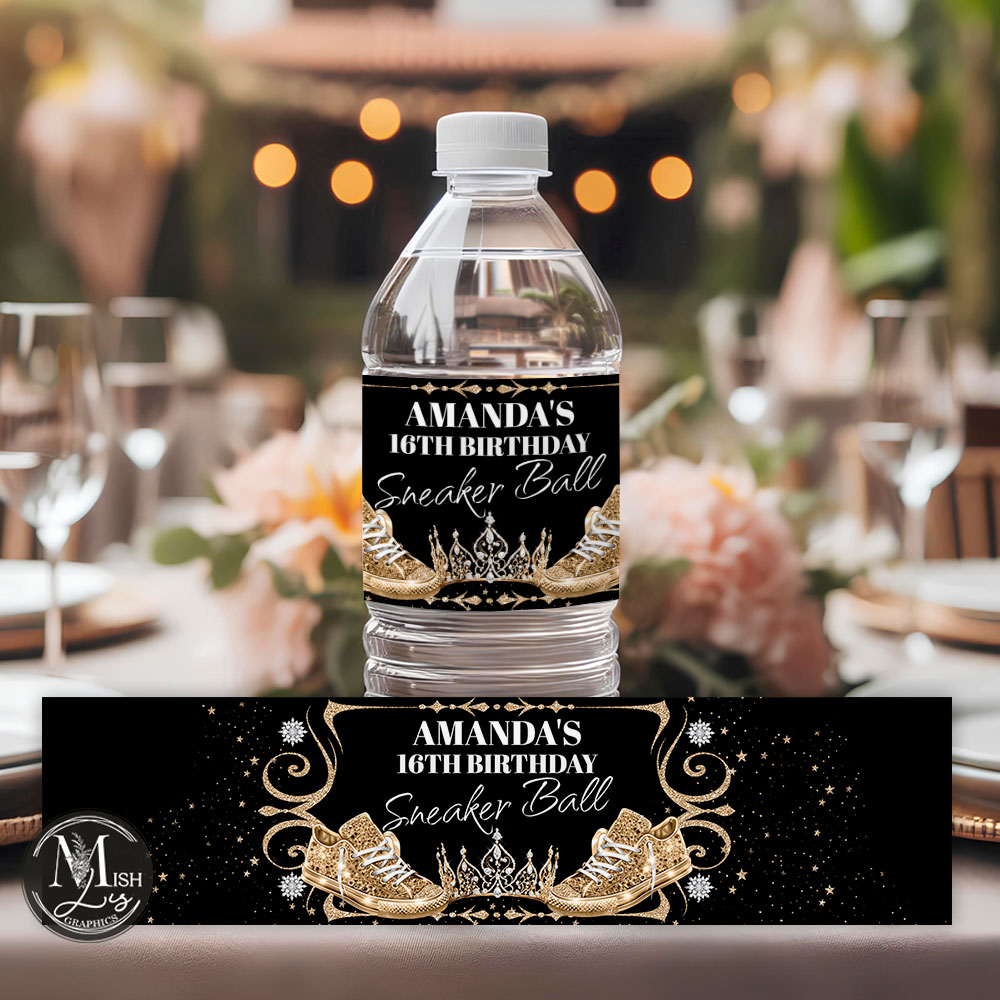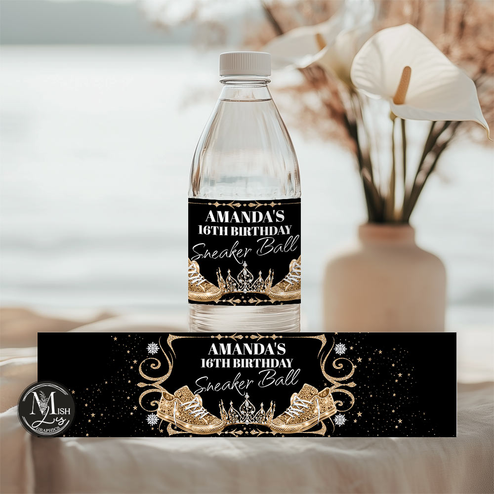 FILE INFORMATION – Royal Black & Gold Sneakers Water Bottle Labels