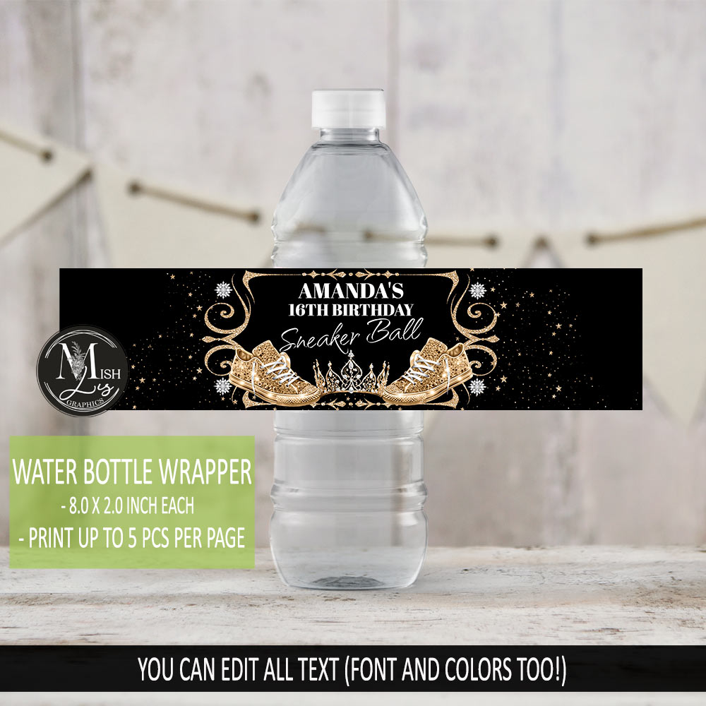 Purchase Royal Black & Gold Sneakers Water Bottle Labels, edit and print. No software needed! Simple, easy to use – Text color and size can be changed.