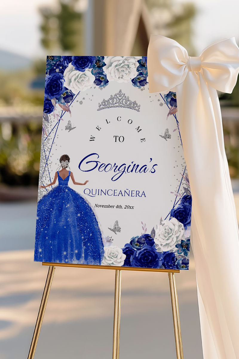 Royal Blue Quinceañera Welcome Sign featuring a silver glitter dress, elegant silver crown, and white & blue floral design. Perfect editable template for Sweet 16 or Mis Quince 15 Años birthday. Add royal elegance to your quince party decorations.