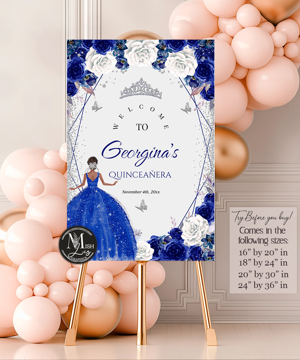 Purchase Royal Blue Quinceañera Welcome Sign, edit and print. No software needed! Simple, easy to use – Text color and size can be changed.