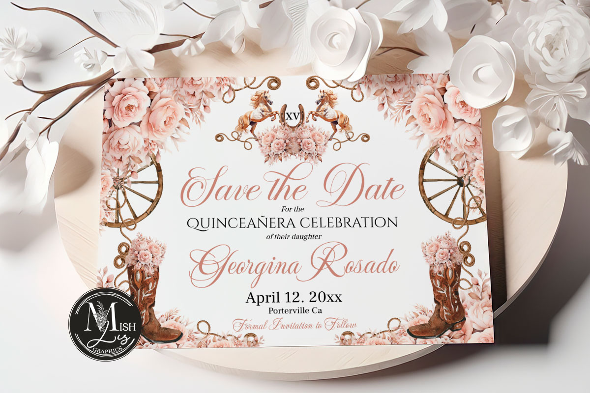 Rustic Country Western Quinceañera Save the Date, Rose Gold Floral & Cowboy Boots Mis Quince 15 Anos Birthday EDITABLE Instant Download