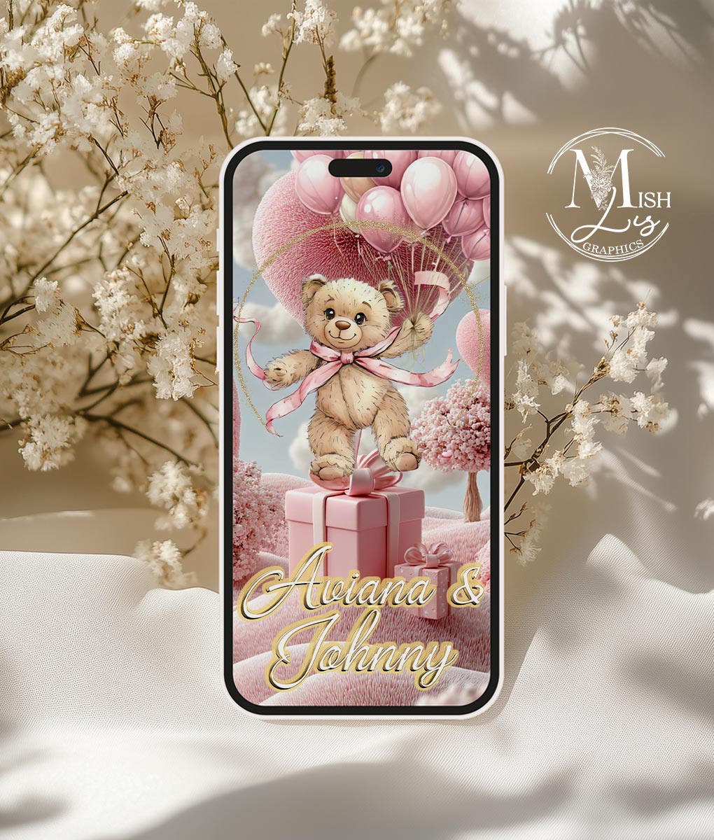 Teddy Bear Baby Shower video invitation is a charming Baby Shower Video Invitation for a sweet girl celebration. This digital Girl Shower Invite features animated pink and brown balloons and a cute teddy bear theme, perfect for sharing by text or social media.